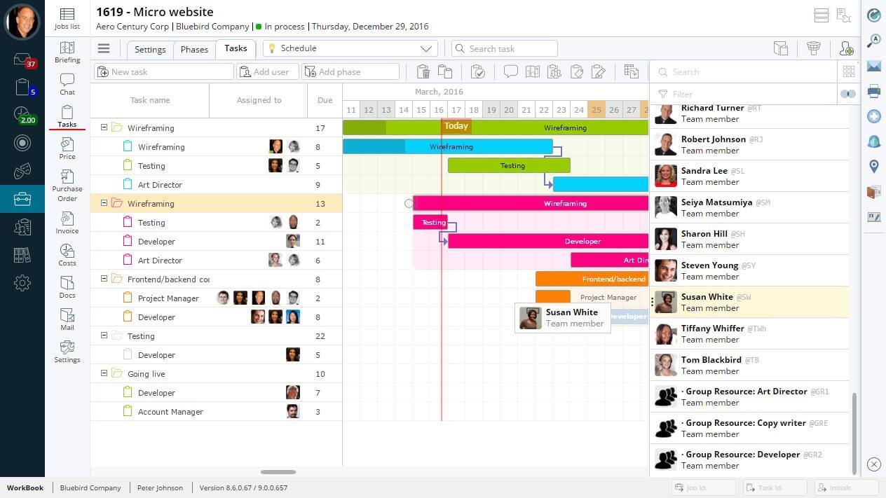 W 17 różnych widokach (m.in. stopień zaawansowania, zaległe zadania, dostępne zasoby), możemy kontrolować na bieżąco postęp prac nad projektami i skutecznie je nadzorować. Dodatkową pomocą jest integracja WorkBooka z Outlookiem oraz Gmailem – pozwalająca na dostęp do kalendarzy wszystkich użytkowników.